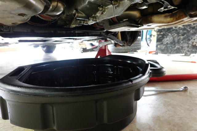 続いてエンジンオイルの交換です、サイドカバーを外してオイルタンク側から古いオイルを抜きます。