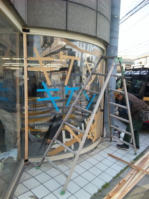 通称、曲がりガラスと呼ばれるコーナーのガラスが割れました。