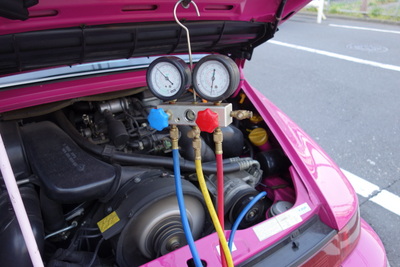車検に行くのに暑くて耐えられそうも無いのでエアコンのガスチャージです。