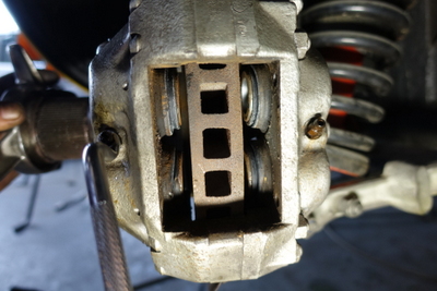 キャリパーの作業開始 ブレーキオイルを抜きます