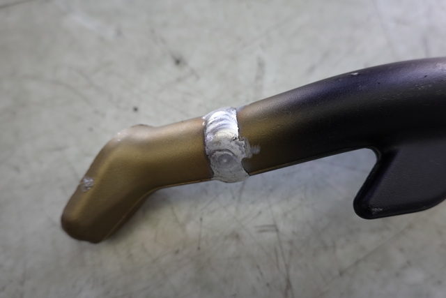 谷原のおじさんにサンダーでカットして貰いドリルで穴を空けスタッドボルトで接合したサイドスタンドの結合部分を溶接屋さんにアルミ溶接してもらいました。
