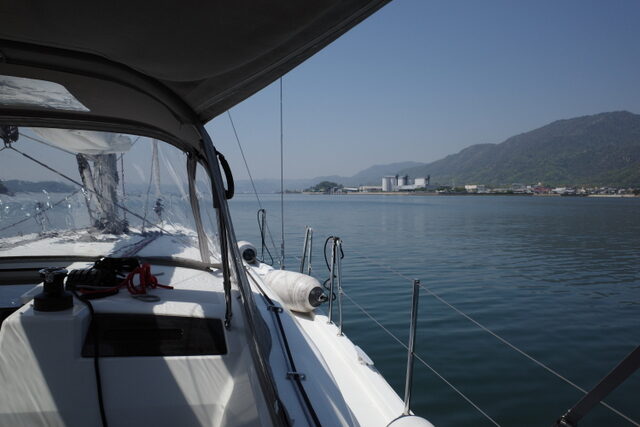 宮島の連絡フェリーの桟橋までは機走で行き、超えたらセーリングの練習開始です。