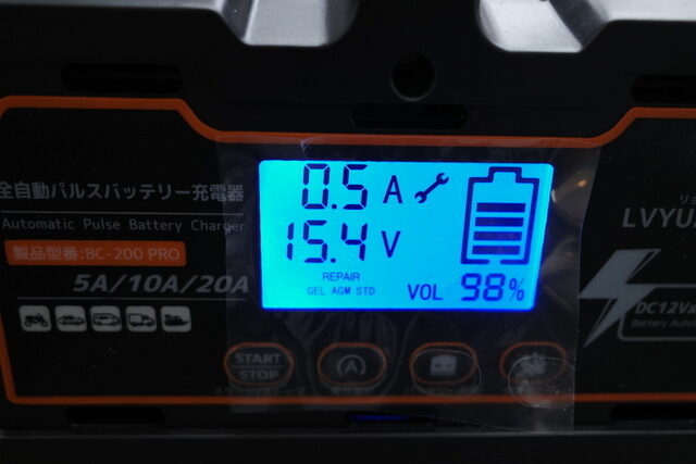 昨日の続きです。約12時間位 パルス充電した結果です。電流も0.5Aと完全に復活した感が有ります。今暫く充電してテストしたいと思います。