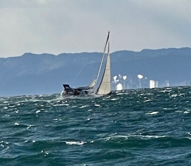 離岸後は強風の中ジブセールを上げて45度?ヒールしながら爆走していました。海水がオンザデッキ? 乗っていなくて良かったかも? 私は全て仕舞って機走です。笑)
