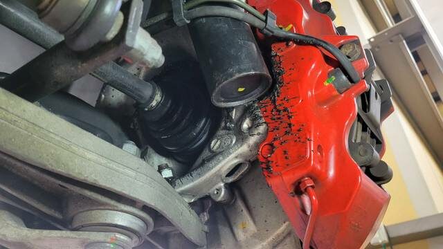 ドライブシャフトブーツが切れて中のグリスが飛び散っていました!やはり定期的に点検整備は必要ですね!ブレーキキャリーパーが飛び散ったグリスで大変な事になっていました。^^;