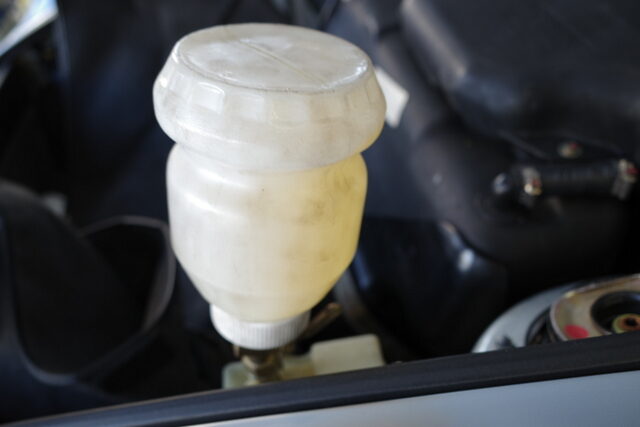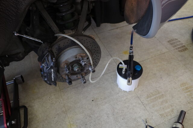 作業開始です。バキュームで古いブレーキオイルを吸い上げます。ある程度の処でブリーダーの11ミリのナットを締めて終了です。4本、8箇所同じ作業をします。
