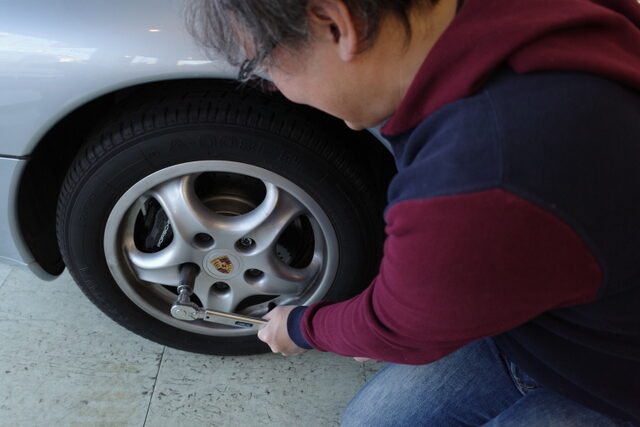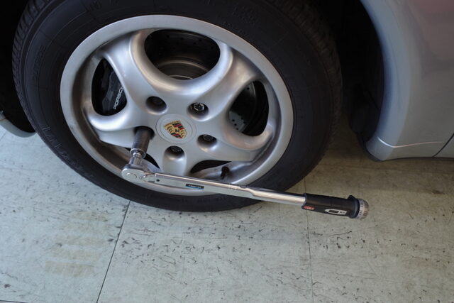 ブレーキオイルの交換が終わった処でタイヤを取り付けてトルクレンチで既定値まで締めます