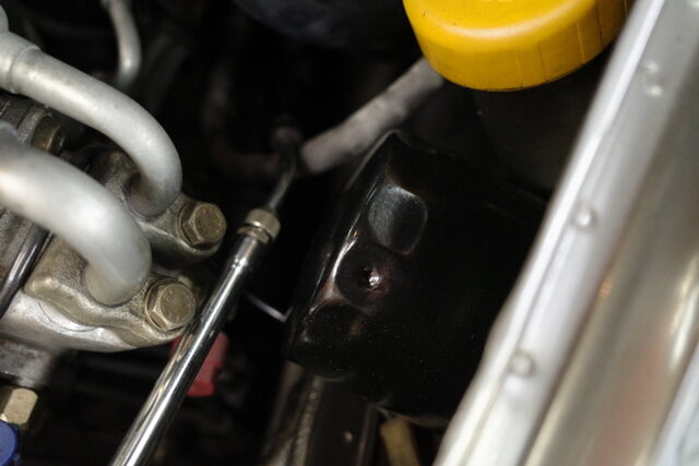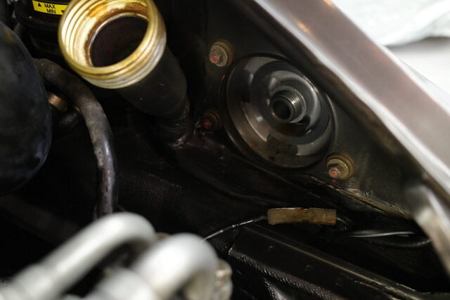 オイルエレメントも交換します。ここで一工夫? 普通にオイルエレメントを外すと著しくオイルで汚します。そこでマイナスのドライバーなのでオイルエレメントに穴を開けてエアーで吹いて中のオイルを出すと全く汚さないで済みます。