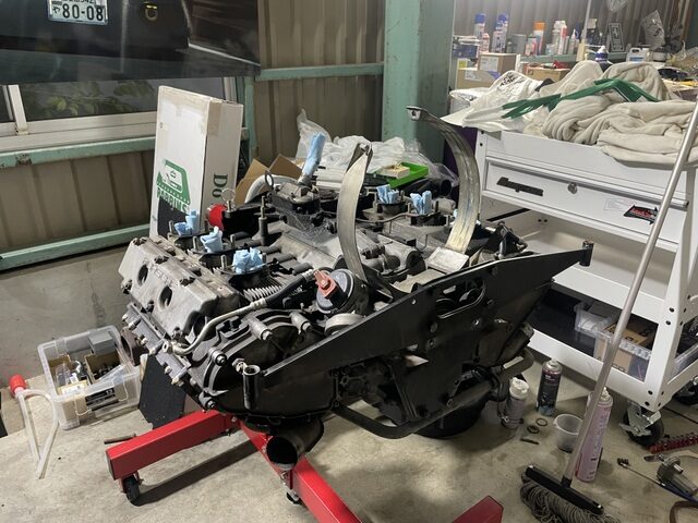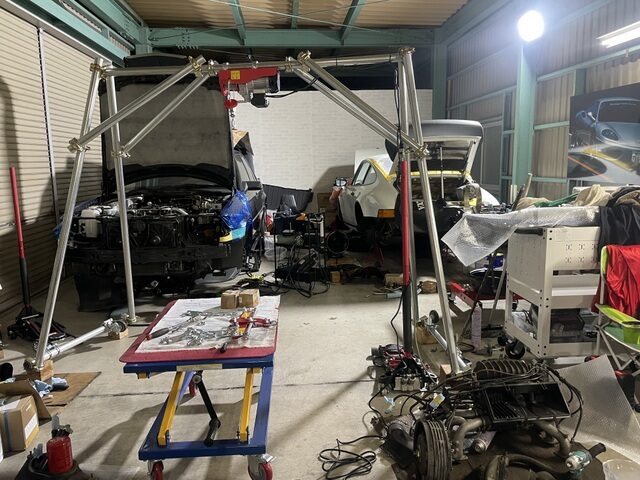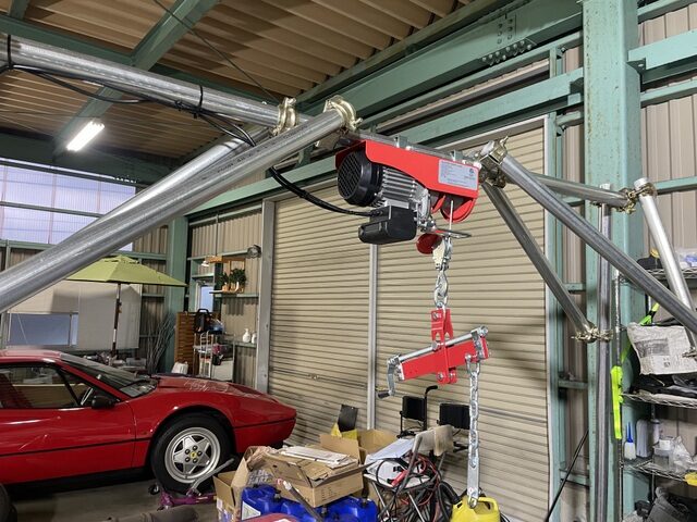 秘密の整備工場化していました。自作のエンジンクレーンも大活躍です