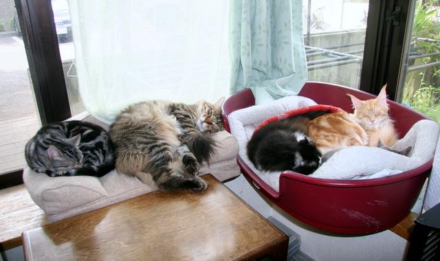 「大型の猫が連なって休む」大型連休ですかぁー。゚( ゚^∀^゚)゚。
